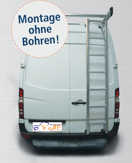 Seit Kurzem führen wir auch Leitern, die ohne Bohrungen an der Hecktür auskommen. Ihre Fahrzeughülle bleibt unbeschädigt, Sie riskieren keine Korrosion und der Wert Ihres Transporters bleibt erhalten. Die Befestigung erfolgt über Montagewinkel (gummigepolstert) an der Ober- und Unterseite der Heckflügeltür. So wird die Tür also angeklemmt.